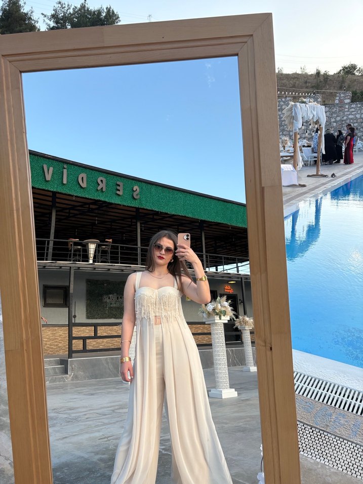Bej renkli, transparan detaylı, straplez ve kolsuz uzun bohem tarzda kadın elbisesi. Düğün ve özel günler için uygun, rahat kesim.