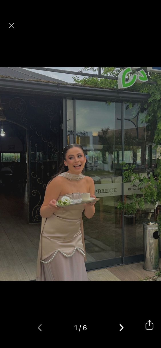 Bej renkte, straplez ve ince askılı, transparan detaylı, incili süslemeli, baskılı, klasik şıklıkta midi boy nişan elbisesi. Abiye elbise özel dikim bir kere isteme de giyildi 160 boy kg 55