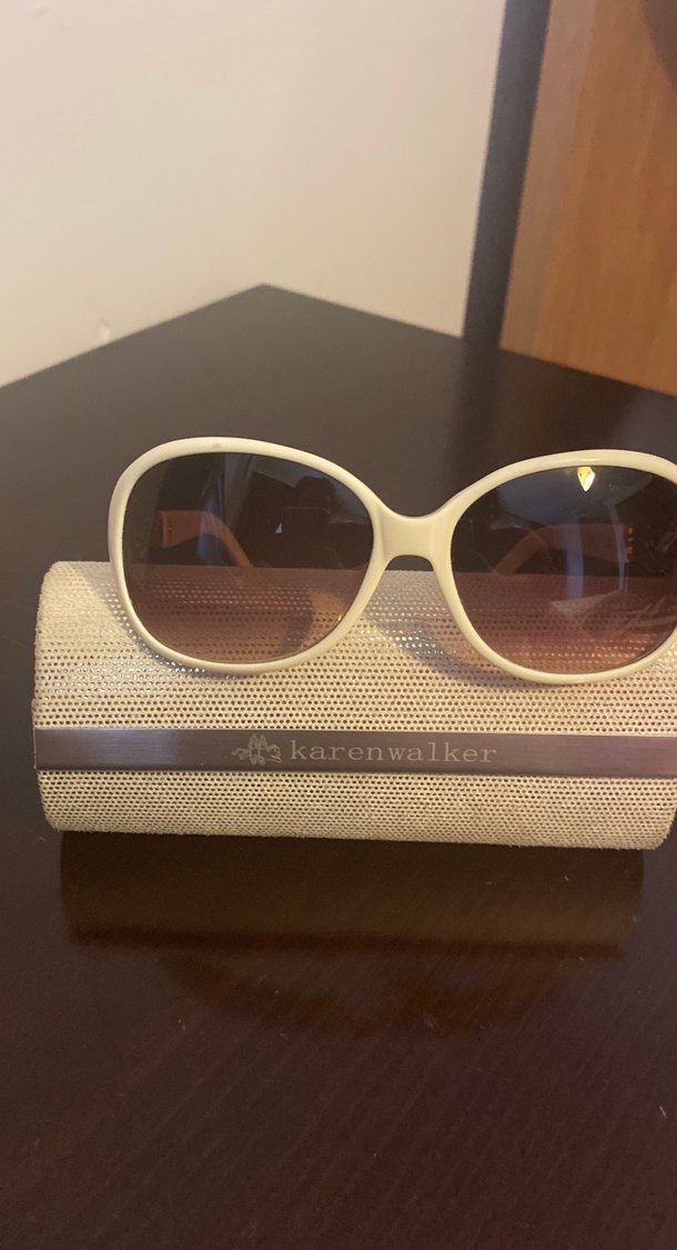 Bej renkte, transparan çerçeveli kadın güneş gözlüğü. Hafif degrade camları ve klasik Paris tarzını yansıtıyor. Karen Walker kutusu ile birlikte.