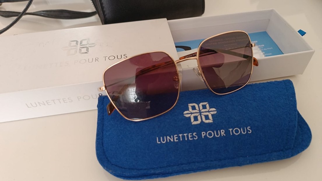 Şeffaf bej çerçeveli, çağdaş kare tasarımlı kadın güneş gözlüğü. "LUNETTES POUR R TOUS" yazılı mavi kılıf ile birlikte sunulur.