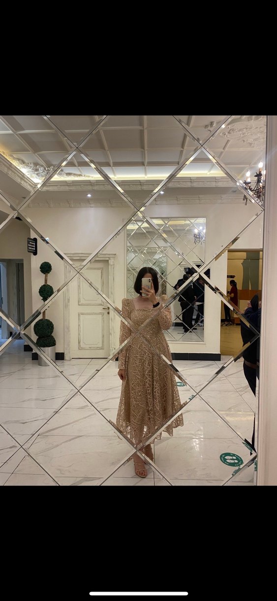 Bej renk, transparan ve soyut desenli kumaştan yapılmış, V yaka ve askılı kollu, normal boy midi abiye elbisedir. Düzenli kesim ve modern klasik stilde, Paris esintili.