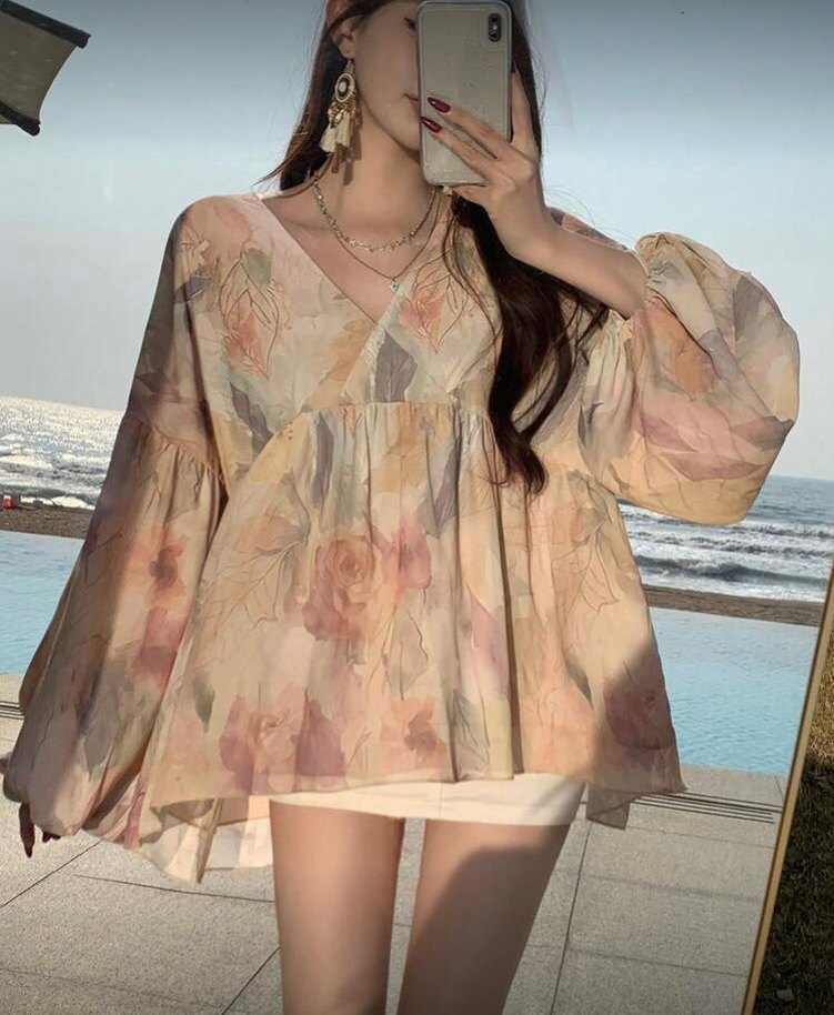 V yaka, uzun kollu, bol kesim bej bluz. Pastel tonlarda tie-dye desenli, ipeksi ve transparan kumaştan, günlük kullanım için uygun.