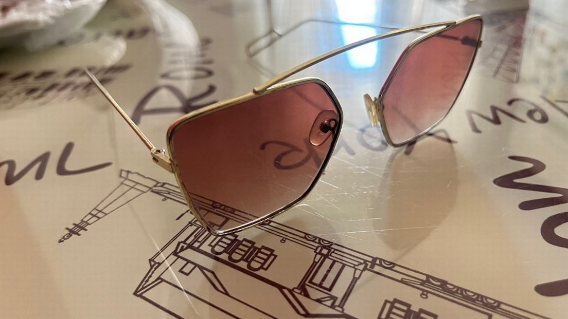Parlak bej renkte, transparan lensli vintage kadın güneş gözlüğü. Retro bohem ve karşı kültür stilini yansıtır.