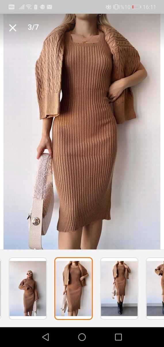 Bej Triko Askılı ikili takım Midi Elbise