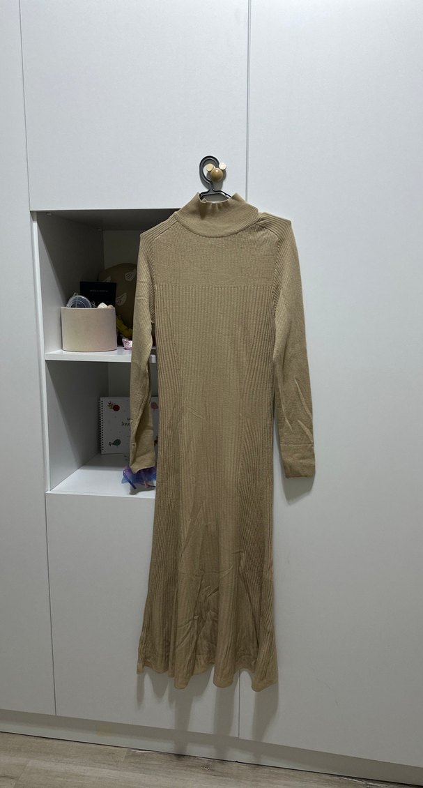 Bej rengi, triko dokulu uzun elbise, balıkçı yaka ve uzun kolludur. Sentetik yumuşak kumaştan üretilmiş, minimalist ve günlük sokak stili için uygundur.