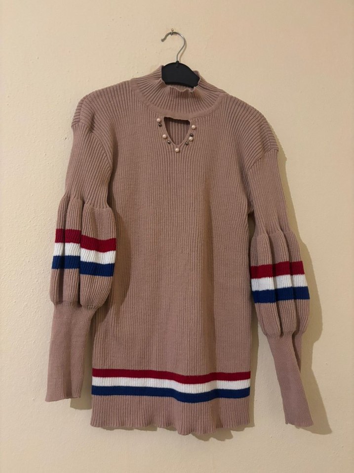 Bej renkli, uzun balon kollu, kırmızı-beyaz-mavi çizgili triko kazak. Boğazlı ve inci detaylı, midi uzunlukta, fit kesim.
