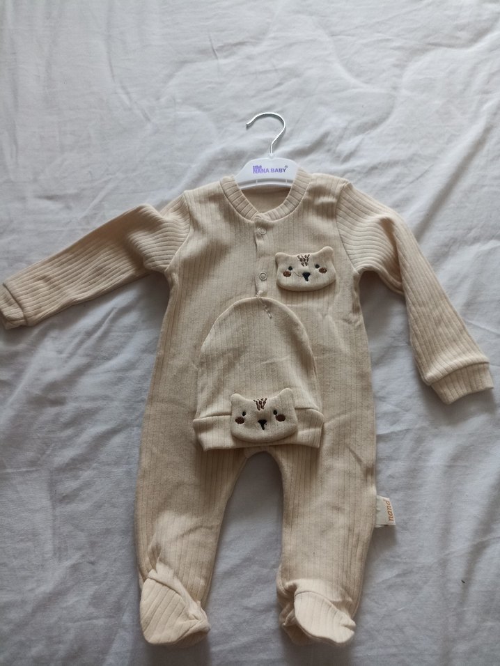 Bej triko kumaştan yapılmış, uzun kollu, yuvarlak yakalı tulum ve sevimli hayvan yüzü detaylı şapka seti. satın alınırsa hemen gönderim yaparım
