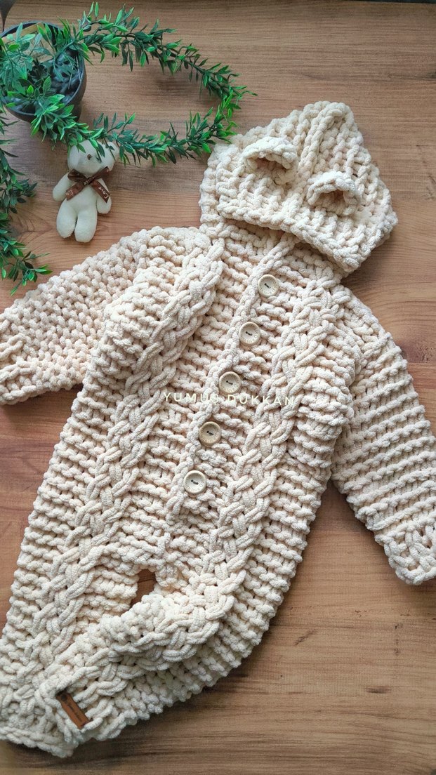 kapüşonlu ve kulak detaylı bej renkli, triko dokulu, uzun kollu bebek tulumu. Önden düğmeli kapanışa sahiptir. 0-2 yaş arası her bedene göre hazırlanır. renk seçenekleri mevcuttur.