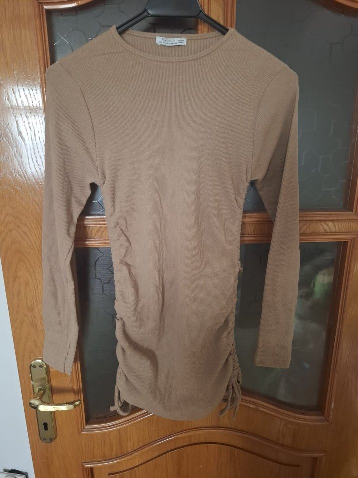 Bej renkli, uzun kollu, bisiklet yaka bluz. Yumuşak keten kumaştan, triko dokulu, midi boy ve sade tasarıma sahip, günlük kullanıma uygun.