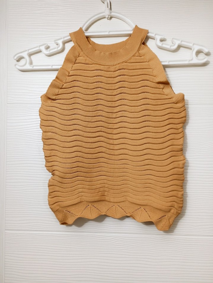 Bej renkli, triko kumaştan yapılmış, boğazlı ve kolsuz, mini uzunlukta, dalgalı desensiz rahat kesim kadın atlet.