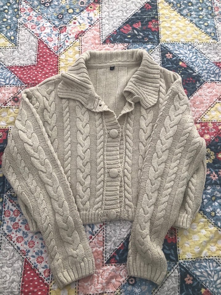 Bej renkli, uzun kollu, yaka detaylı örme triko hırka, rahat bohem tarzıyla günlük kullanım için uygundur.