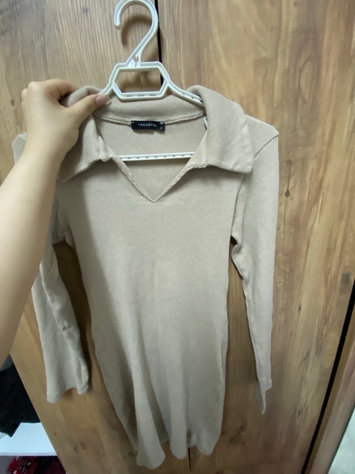 Bej renkli kadın triko, uzun kollu ve V yaka tasarıma sahiptir. Trendyoldan almıştımm