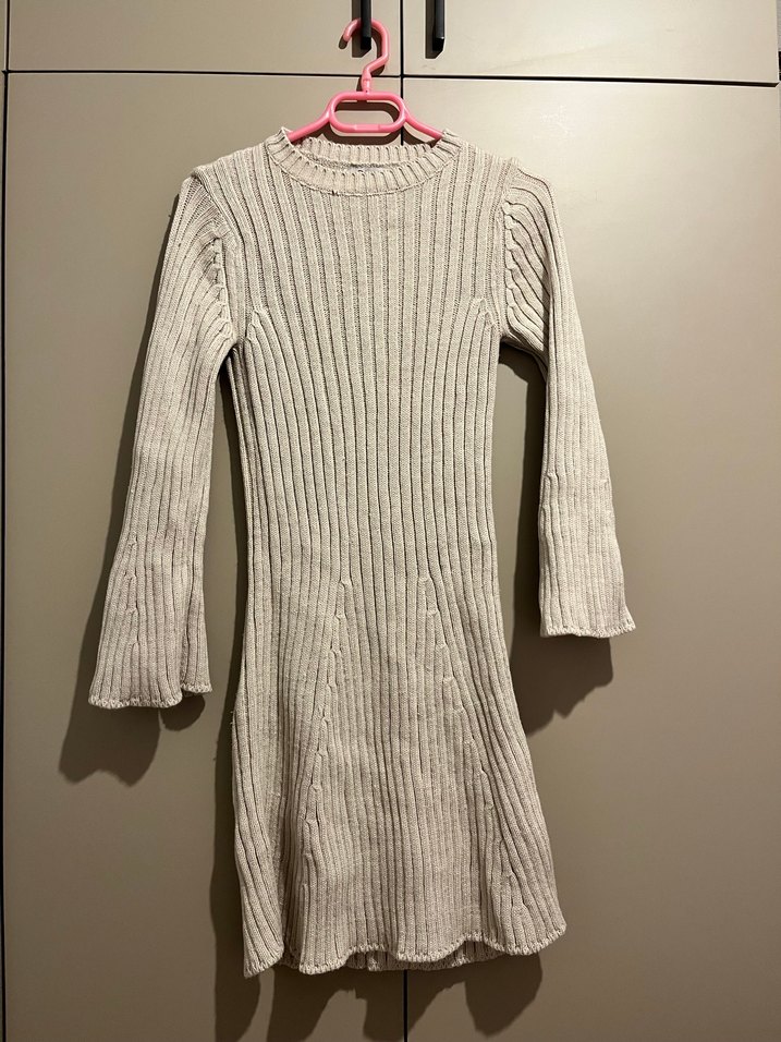 Bej renkli, uzun kollu ve yüksek yakalı triko elbise. İnce dokuma yapısıyla vücuda oturur, midi boy ve desensiz tasarıma sahiptir. Rahat ve günlük kullanıma uygundur.