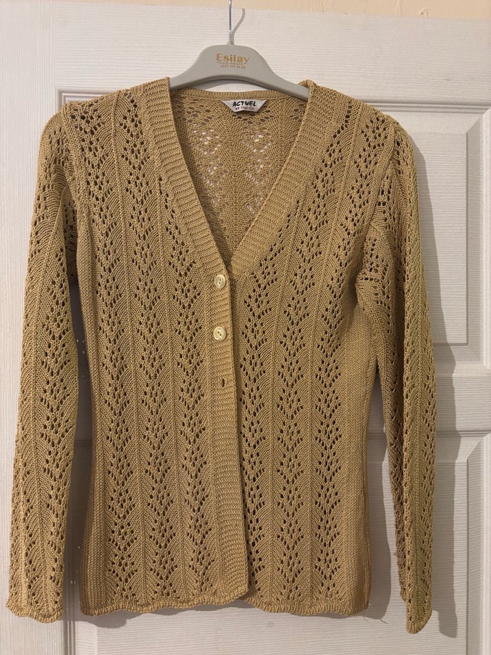Bej renkli, uzun kollu, triko kadın hırka. Geniş kesim ve parlak dokusuyla rahat, bohem tarzı yansıtır.