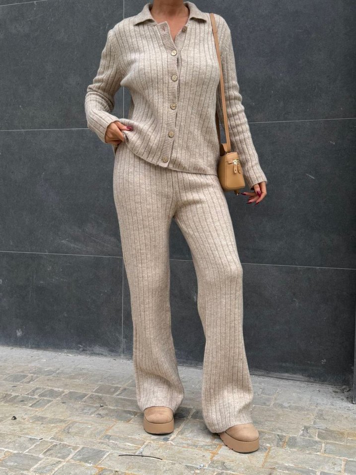Bej renkte, yumuşak triko kumaştan yapılmış, regular fit ve ispanyol paça kesim kadın pantolon. Günlük rahat ve şık sokak tarzı için uygundur.
