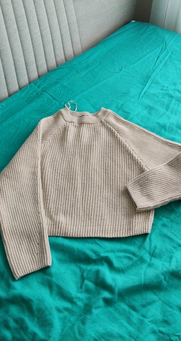 Bej renkli, yuvarlak yaka ve uzun kollu örme kadın kazak. Salaş kesimi ve normal boyuyla gündelik sokak stiline uygundur.