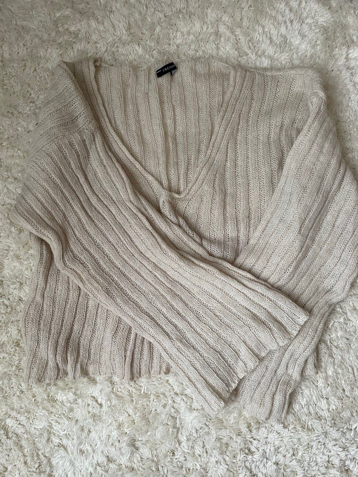 Bej renkte, uzun kollu ve tek renkli, rahat kesim triko kazak, günlük kullanıma uygun konforlu bir modeldir.