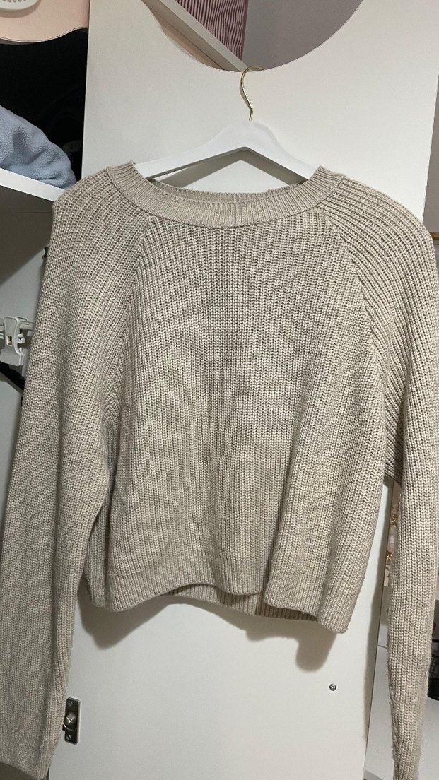 Bej renkli kadın kazak, uzun kollu ve yuvarlak yaka tasarıma sahiptir. Triko dokusu ve bol kesimiyle rahat bir kullanım sunar.