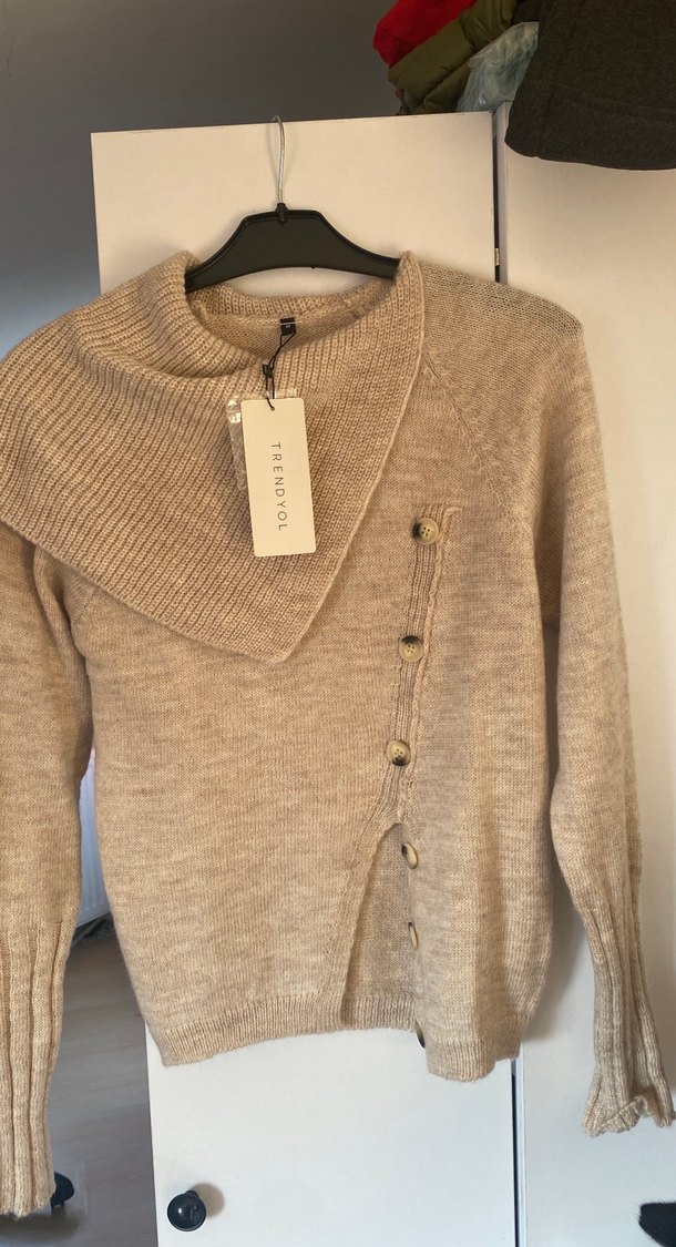 Bej renkli, uzun kollu ve bisiklet yaka triko kazak. Rahat kesimi ve düğme detayları ile günlük kullanıma uygundur.