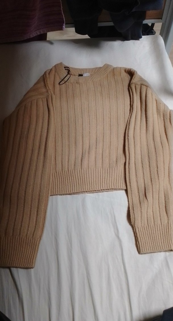 Bej renkte, uzun kollu ve yuvarlak yakalı triko kadın kazak. Rahat kesimi ve midi boyu ile günlük ve sokak modasına uygundur.