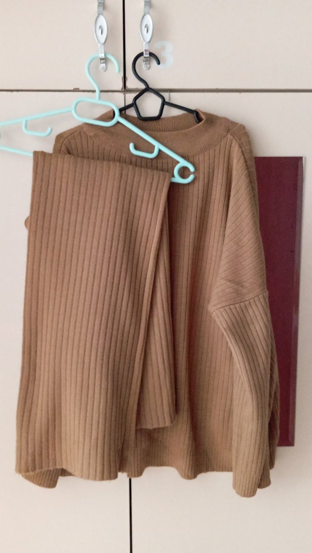 Bej renkte, salaş kesim ve yuvarlak yakalı triko takım. Uzun kollu ve midi boyda, rahat günlük kullanım için ideal. standart beden.