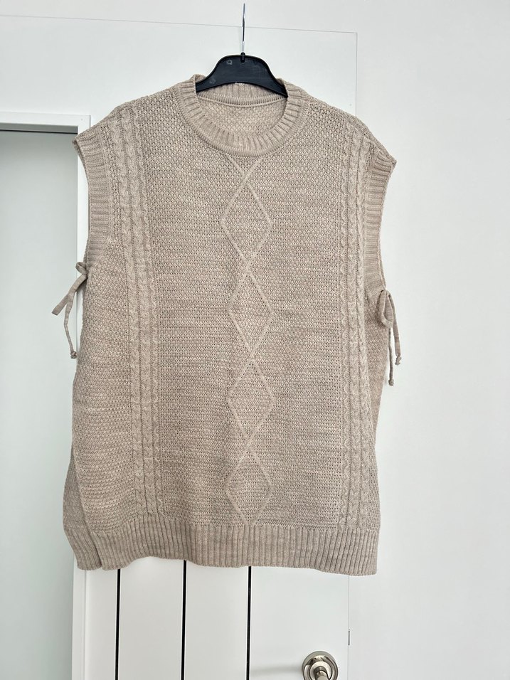 Bej renkli, triko örme, kolsuz süveter. Yuvarlak yaka ve bol kesimiyle rahat, bohem tarzda günlük kullanıma uygun.