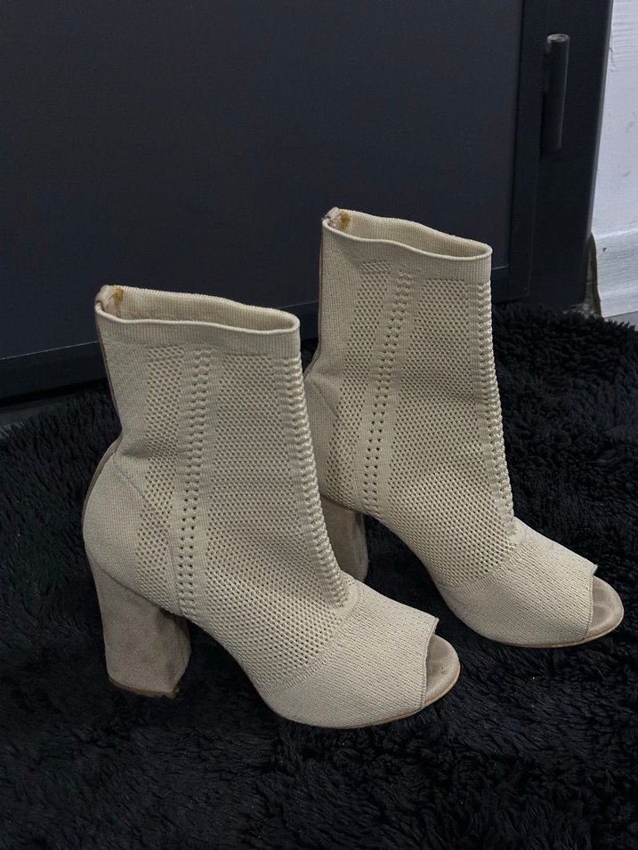 Blok topuklu, triko kumaştan yapılmış bej kadın botları, rahat ve desen içermeyen tasarımıyla sokak modasına uygun.