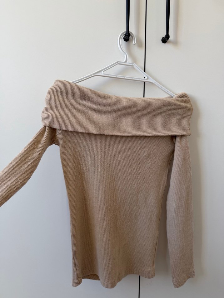 Bej renkli, kayık yakalı, uzun kollu, fitted kesim ve triko örme yapıda yün kadın kazak. Midi boyda, rahat sokak stiline uygun. #carmenyaka