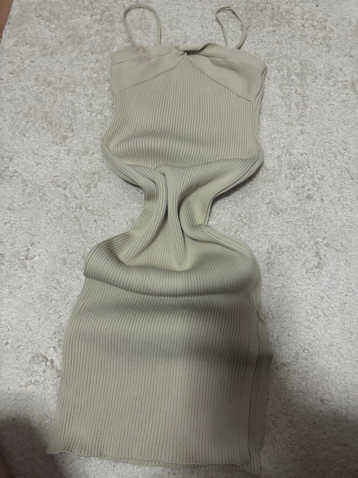 Bej-gri tonlarında, askılı ve straplez yaka detaylı, vücuda oturan triko midi elbisedir. Rahat ve günlük sokak stili için uygundur.