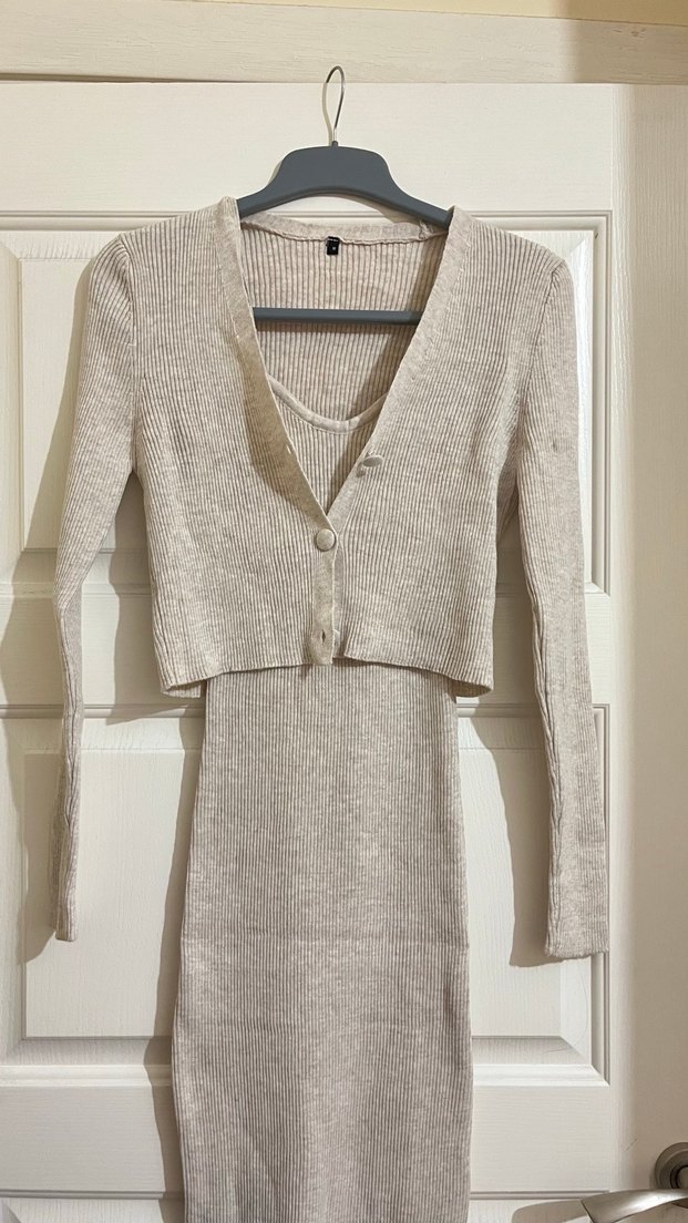 Bej renkte, v yaka ve uzun kollu, triko kumaştan midi boyda, vücuda oturan rahat bir elbisedir. Bir kere giyildi yepyeni