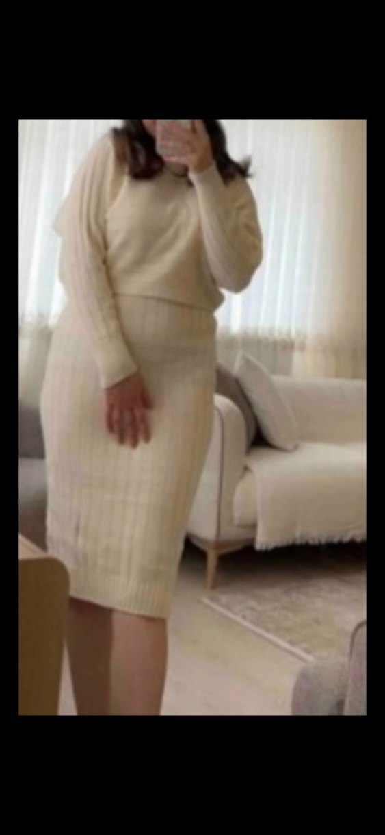 Bej renkli, triko kumaştan, uzun kollu, bisiklet yaka ve vücuda oturan midi elbisedir. Ofis için rahat ve şık bir tercihtir. tek bir kez giyildi.sorunsuz