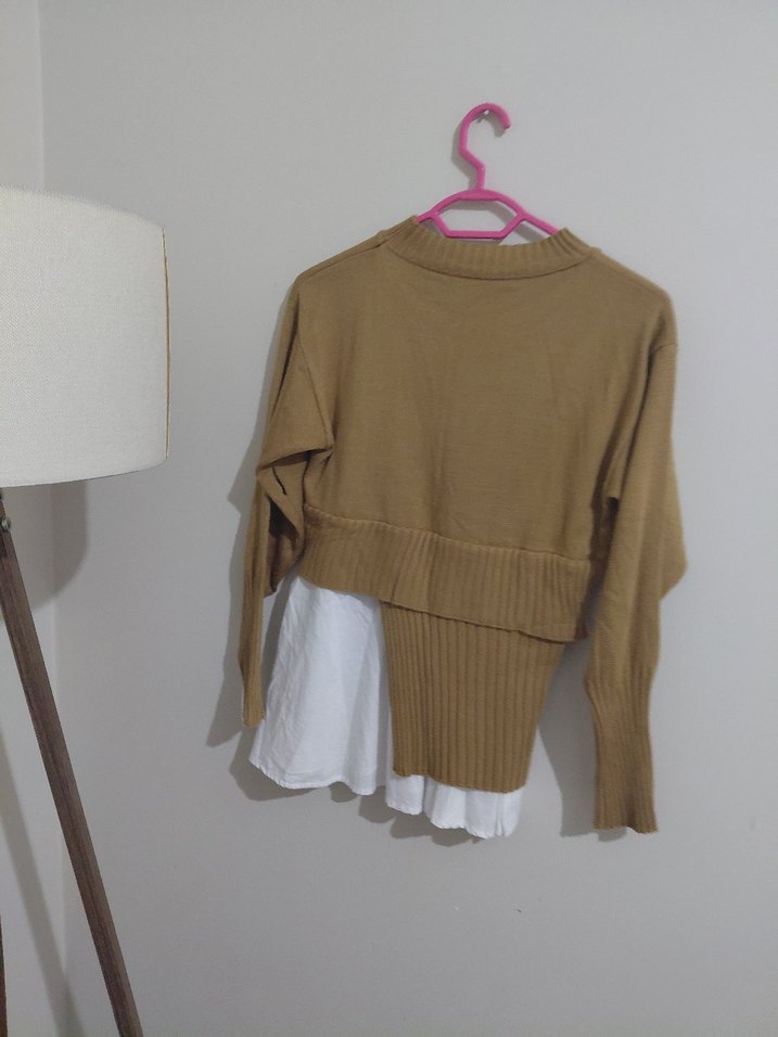 Bej renkte, uzun kollu, triko dokuma, midi boy, bol kesim kadın kazak. Yuvarlak yaka ve günlük sokak stili için uygundur.