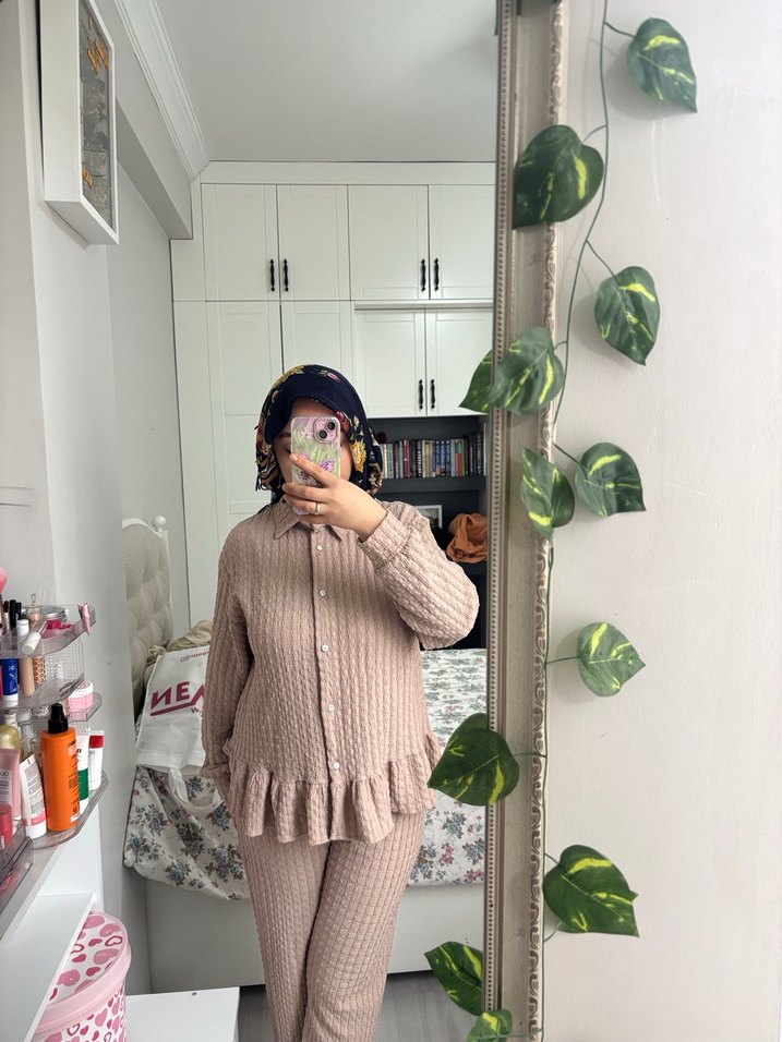 Uzun kollu, yakalı ve midi boyda bej triko takım. Rahat kesimi ve fırfırlı etek ucu ile günlük kullanıma uygundur. Sorunu yoktur bir kere giydim bana kısa geldi