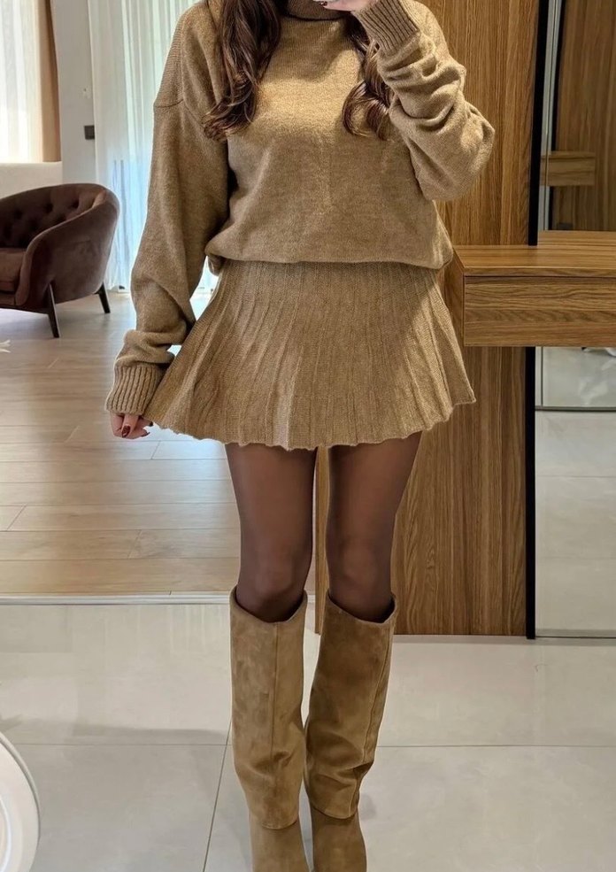 Bej renkte, örgü dokulu ve süet hissi veren, bol kesim, desensiz mini etek. Günlük kullanıma uygundur.