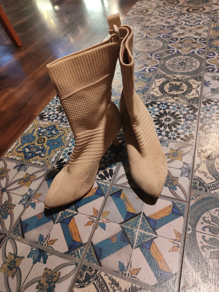 Bej renkte, triko kumaştan yapılmış stiletto topuklu kadın botları. Günlük kullanım için modern ve desensiz tasarım, Paris tarzında.
