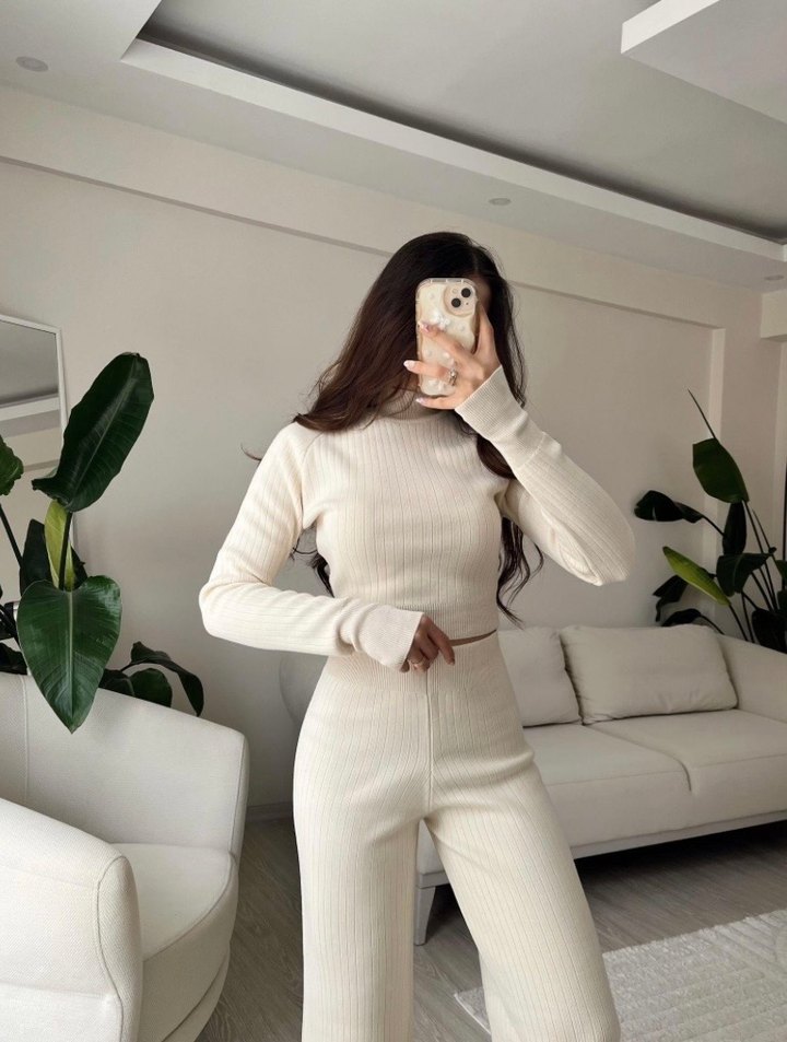 Bej yarım balıkçı yaka örgü parmak geçmeli triko crop kazak yüksek bel pantolon triko alt üst ikili takım standart beden mevcuttur