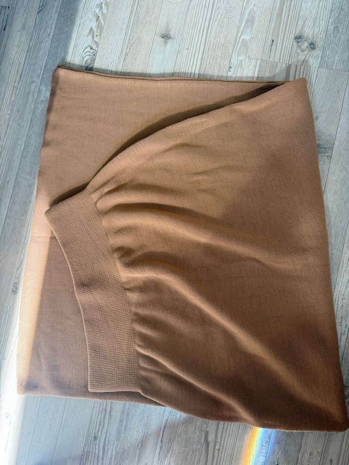 Bej renkli, yumuşak sentetik kumaştan yapılmış ve uzun kesimli etek.Rahat günlük kullanım için uygundur.