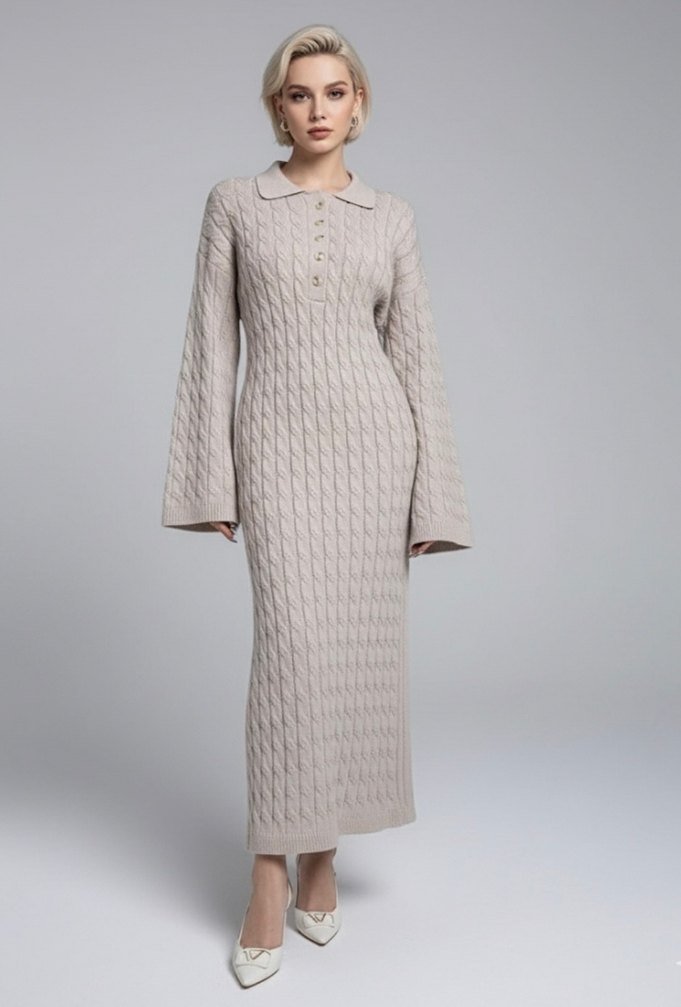 Bej renkte, triko dokulu uzun elbise, uzun kollu ve yüksek yakalıdır. Rahat kesimi ve sade tasarımıyla günlük kullanıma uygundur.