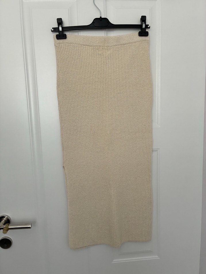 Bej renkli, triko kumaştan yapılmış, vücuda oturan uzun etek. Rahat ve sade tarzıyla günlük kullanıma uygundur.