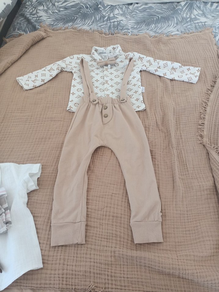 Yumuşak pamuklu, bej renkte triko uzun kollu üst ve askılı pantolondan oluşan bebek takımı.