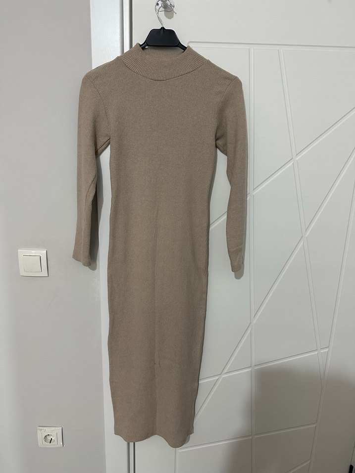 Bej renkli, yüksek yakalı ve uzun kollu triko elbise bir kez giyildi