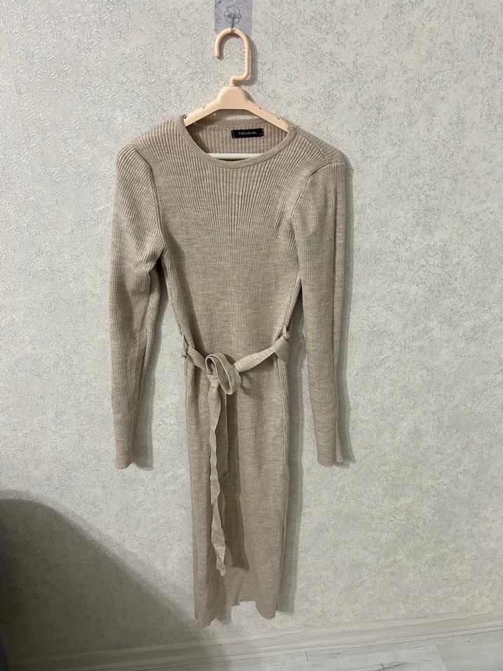Bej renkli, triko örgü uzun kollu, beli kemerli ve vücuda oturan kesime sahip kadın elbisesi. Rahat ve gündelik stil sunar.
