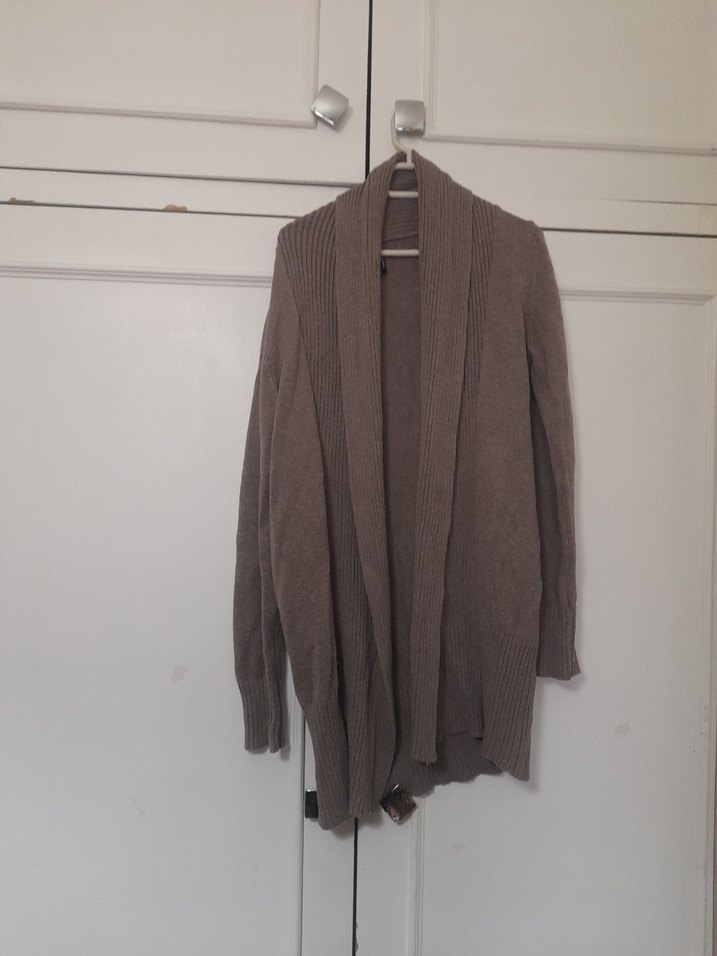 Bej renkte, yumuşak yün kumaştan örülmüş, uzun kollu ve bol kesim kadın hırka. Notlu yakalı ve midi boyda, rahat kullanıma uygun bir parça.