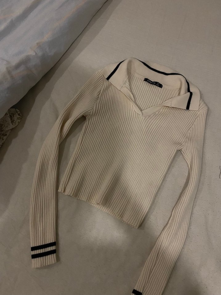 Bej renkli, uzun kollu ve yakalı, fit kesim kadın triko kazak. Siyah şerit detaylarıyla günlük ve sokak modasına uygun yumuşak dokulu.