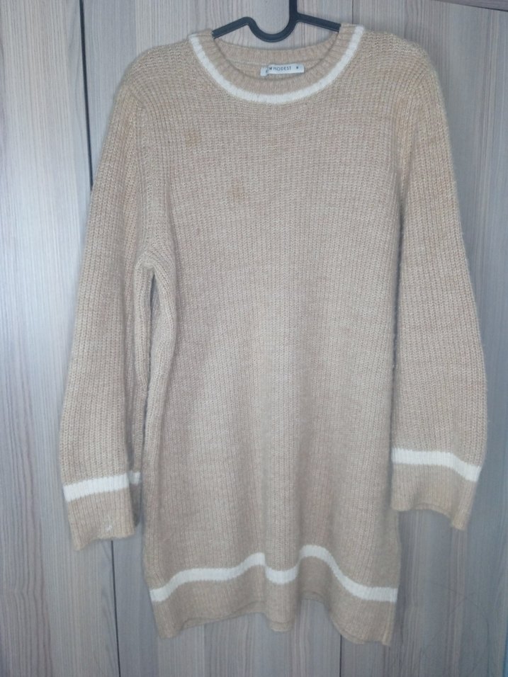 Bu bej triko kazak, yuvarlak yaka ve beyaz şerit detaylı uzun kollara sahiptir. Salaş kesimi ve midi boyuyla günlük kullanıma uygundur.