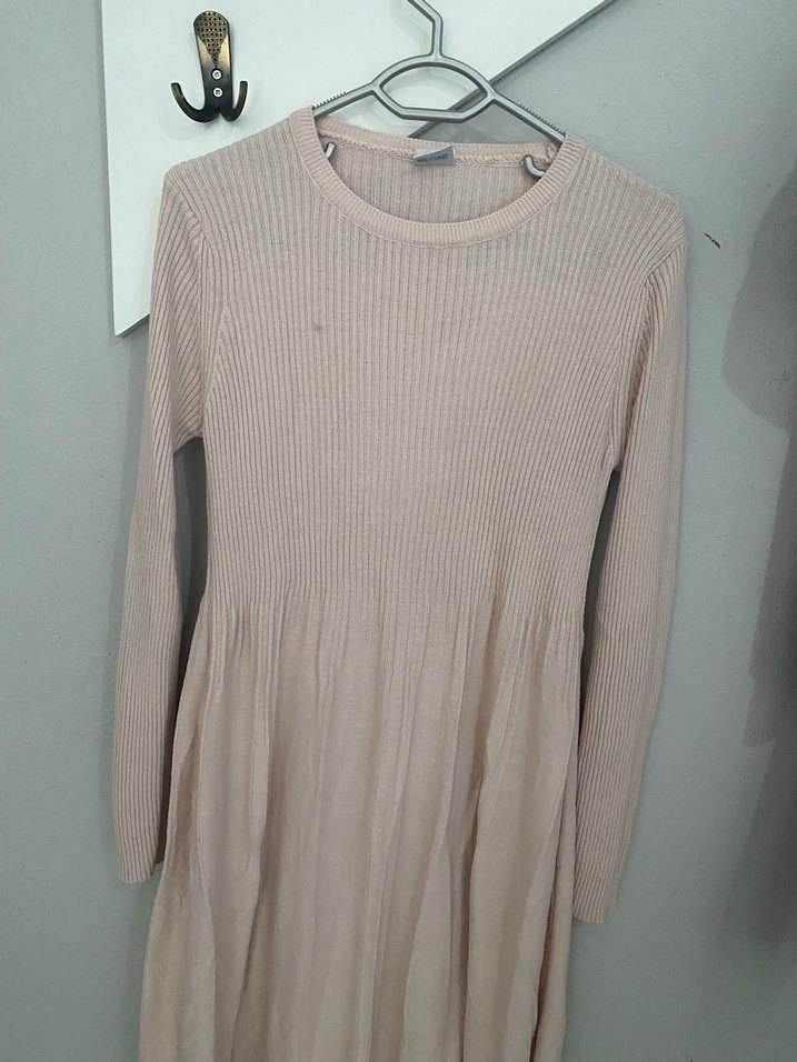 Bej renkli, triko örme, yuvarlak yakalı ve uzun kollu midi elbise. Gevşek kesimi ve yumuşak keten kumaşıyla günlük rahatlık sağlar.