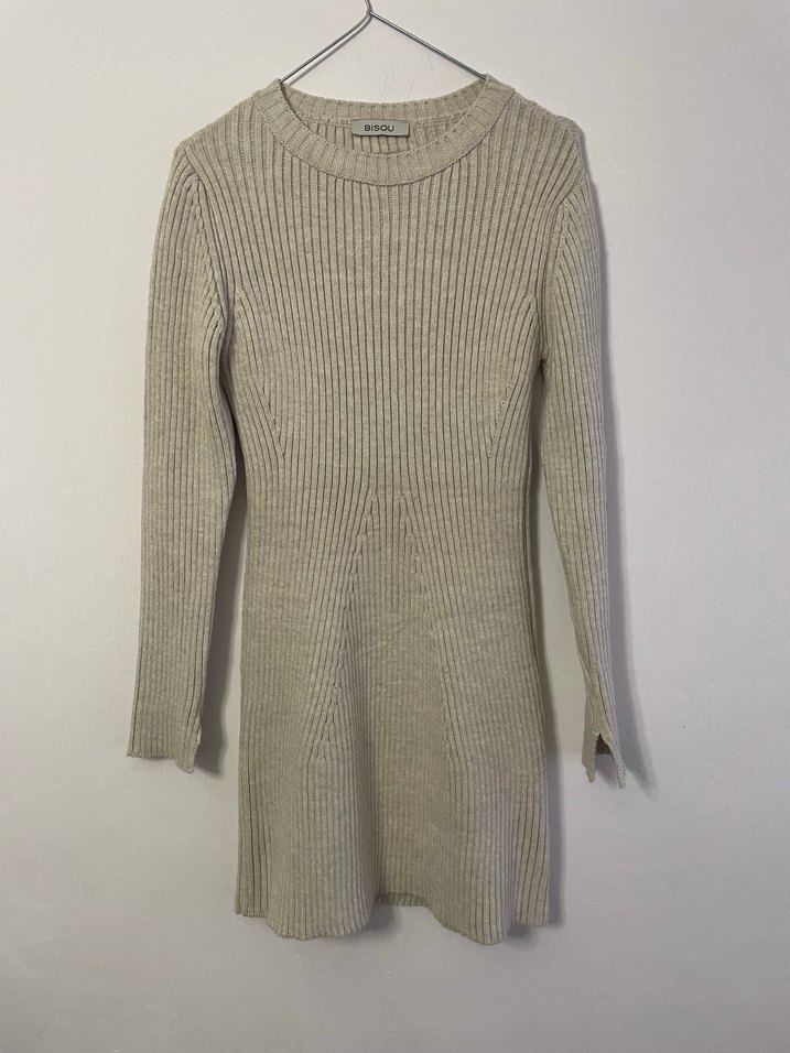 Bej renkli, uzun kollu, yuvarlak yakalı, vücuda oturan triko elbise. Yumuşak, fitilli dokusuyla midi boyda, günlük kullanıma uygun.
