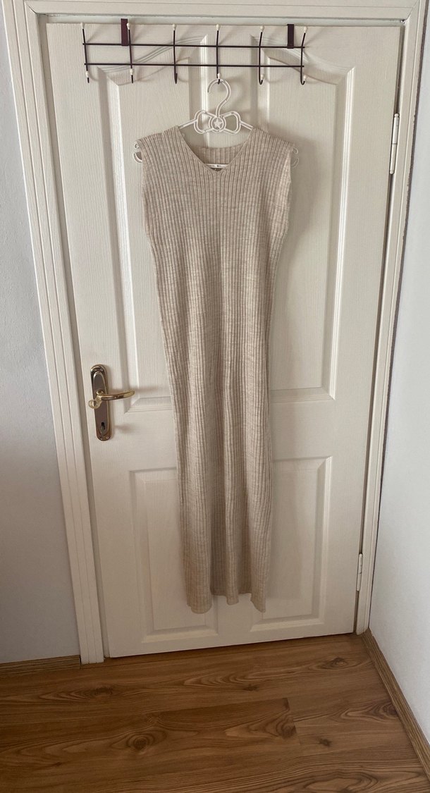 Bej renkli, triko dokulu uzun kolsuz elbise.rahat kesime sahip, günlük kullanıma uygundur elbisenin dışında kazağı da mevcut s m uyumlu