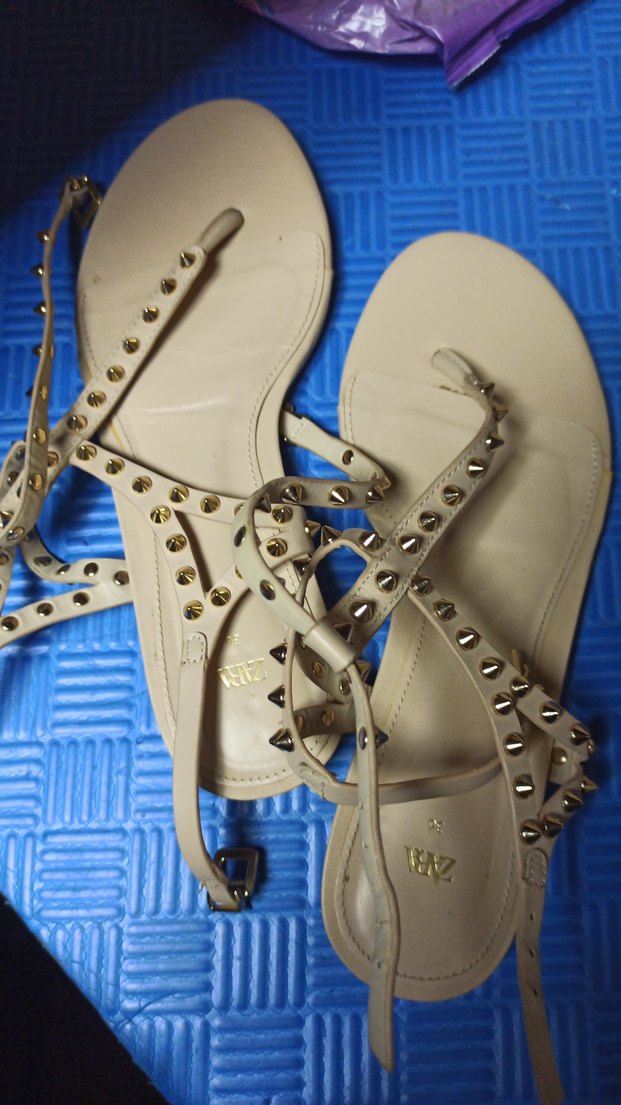 Bej renkli, zimbaliı kadın sandaletleri, çivili kayışlarla ve kauçuk malzemeden üretilmiştir. Günlük kullanıma uygundur.