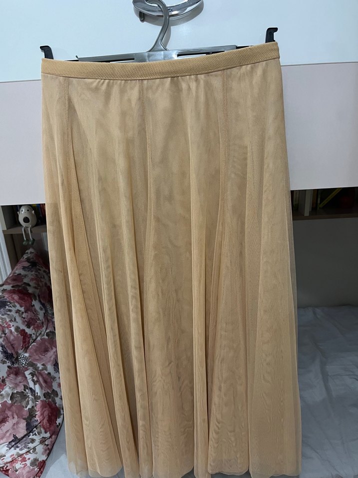 Bej renkli, tül kloş uzun etek. Astarlıdır. Sadece 1 kez giyildi özel gün için kullanıldı . Lamelif markasına aittir. 40-42 beden için uygundur